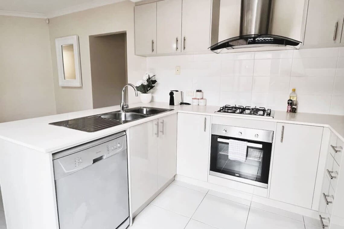 Full kitchen – oven, stovetop, rangehood, microwave, dishwasher, kettle, toaster
