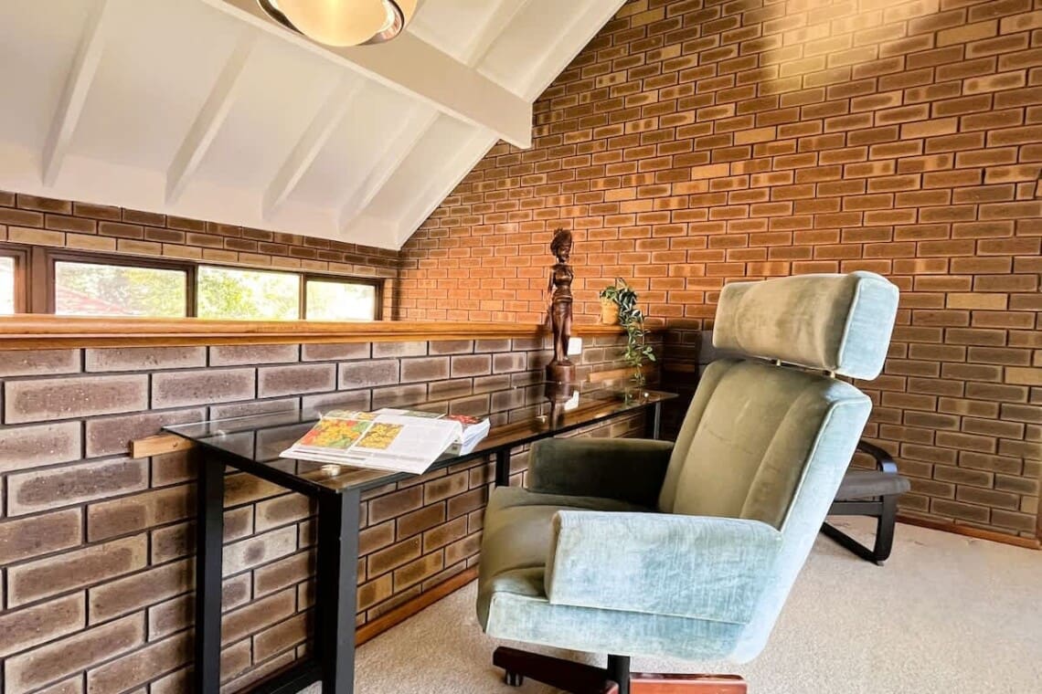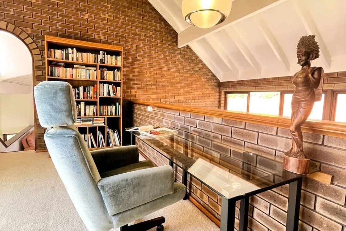 Upstairs open mezze-level workspace with desk and chairs & books to peruse!