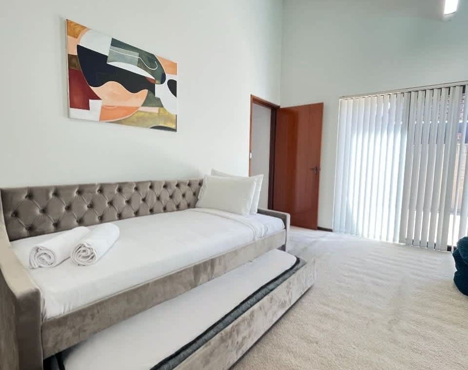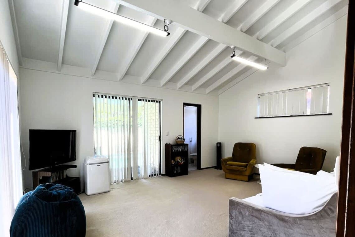 Rumpus room at the front of the home has a RETRO game play setup, board games, chess etc – a chillout zone for the kids but doubles as the 4th bedroom with 2 single beds.