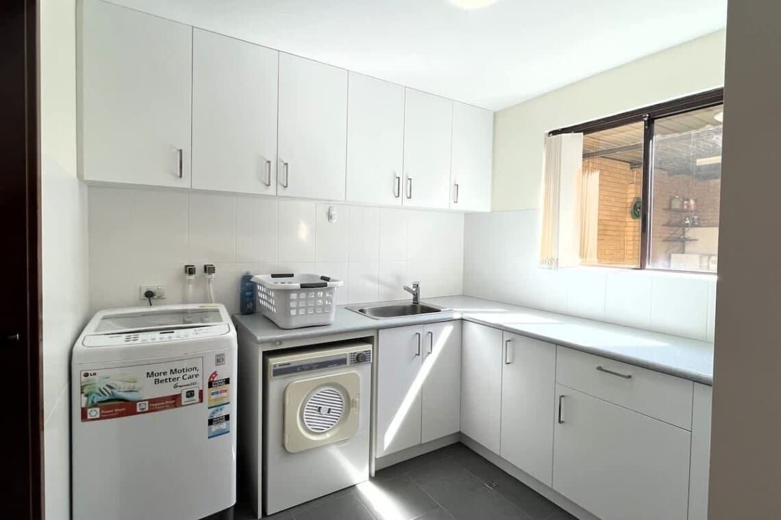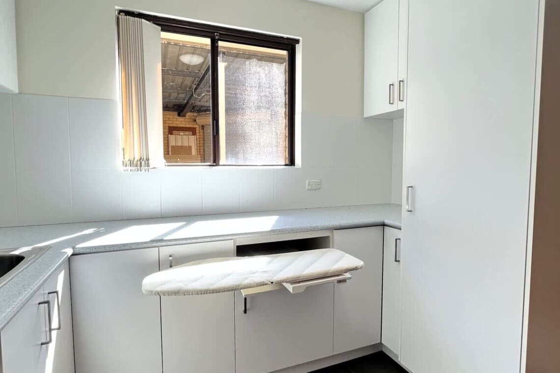 Built in ironing board in laundry & iron, lots of space.
