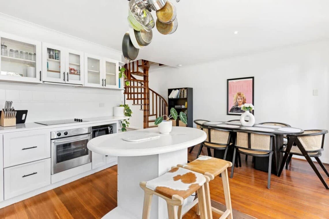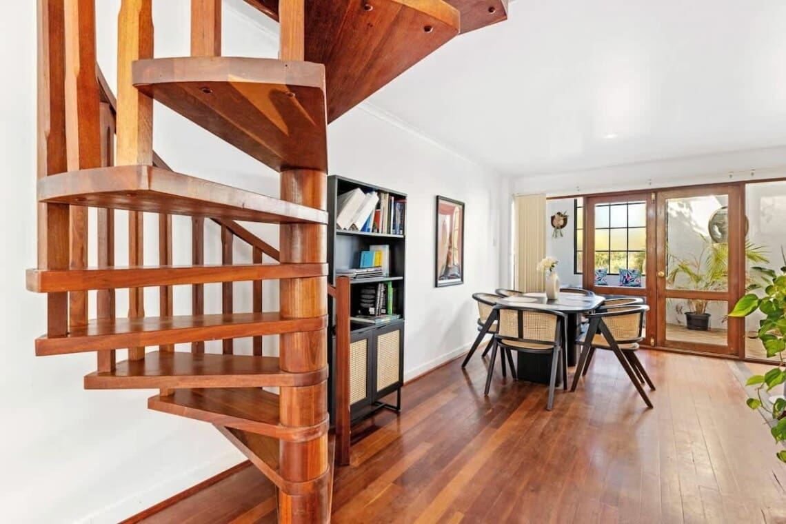 2 Bedrooms up a stunning jarrah sprial staircase – one QB, plus hanging space to unpack.