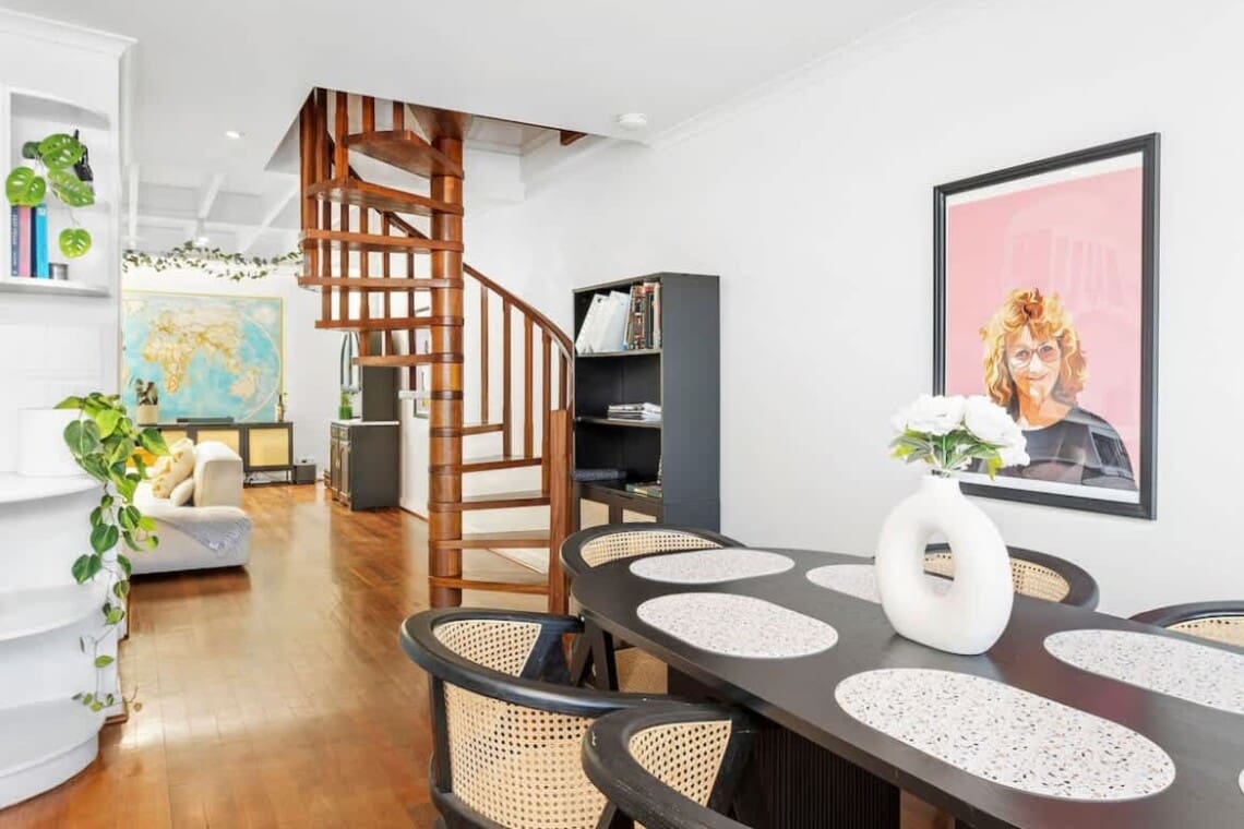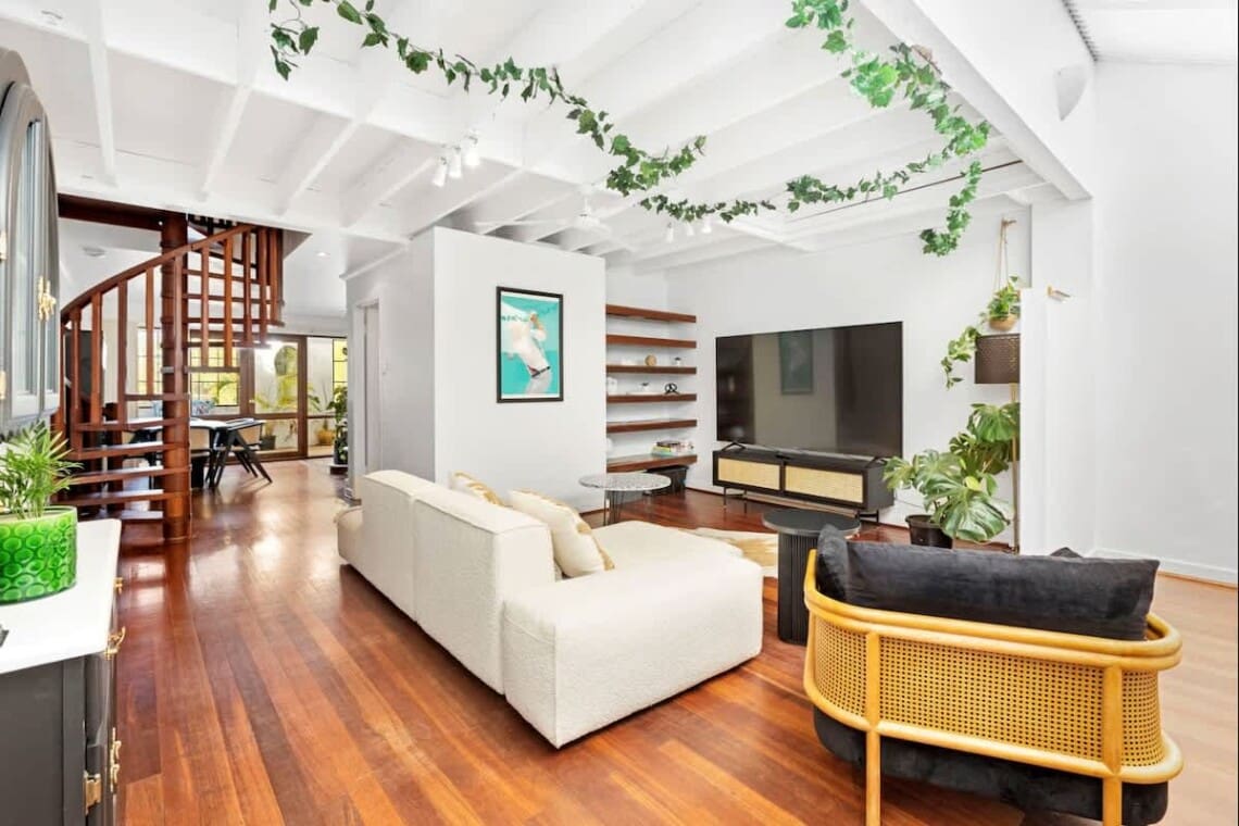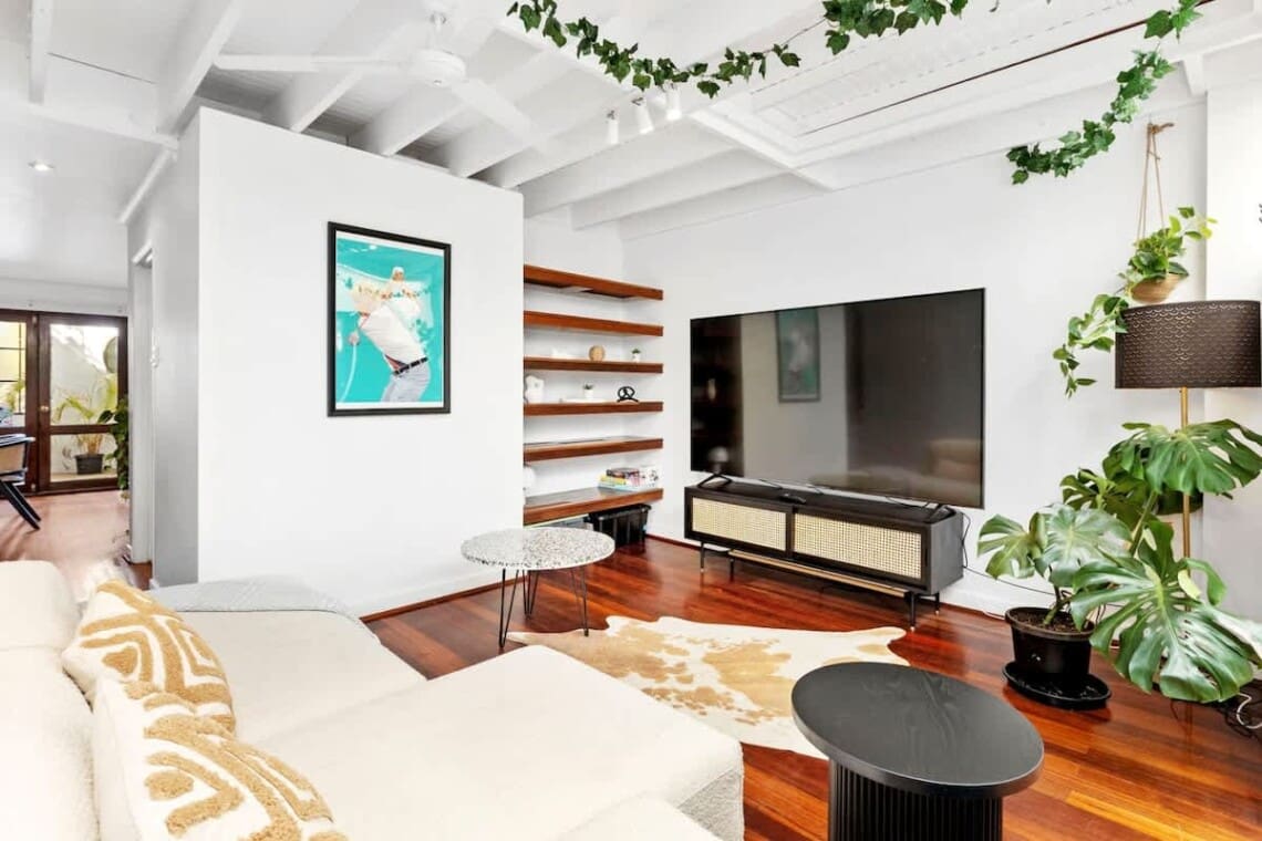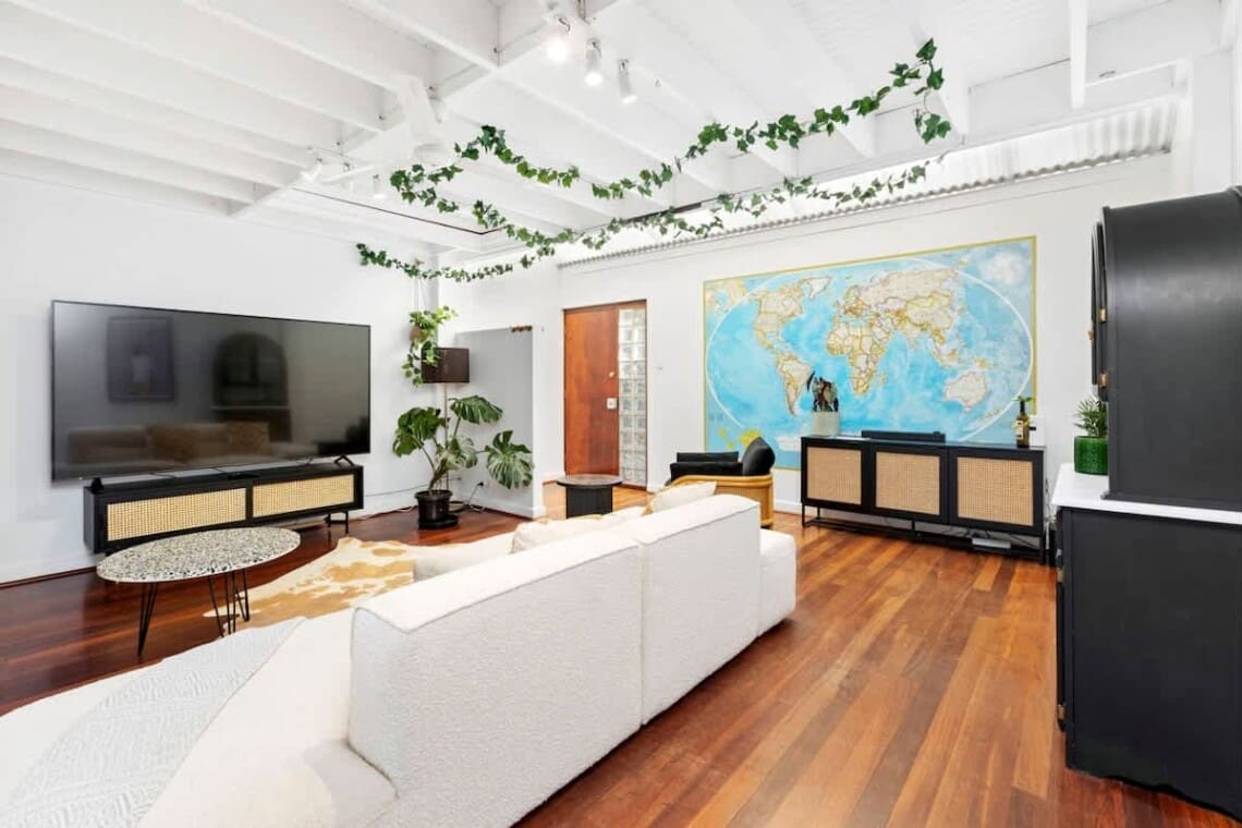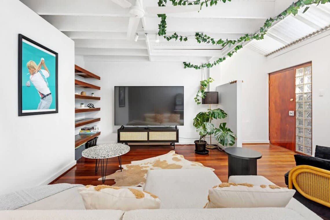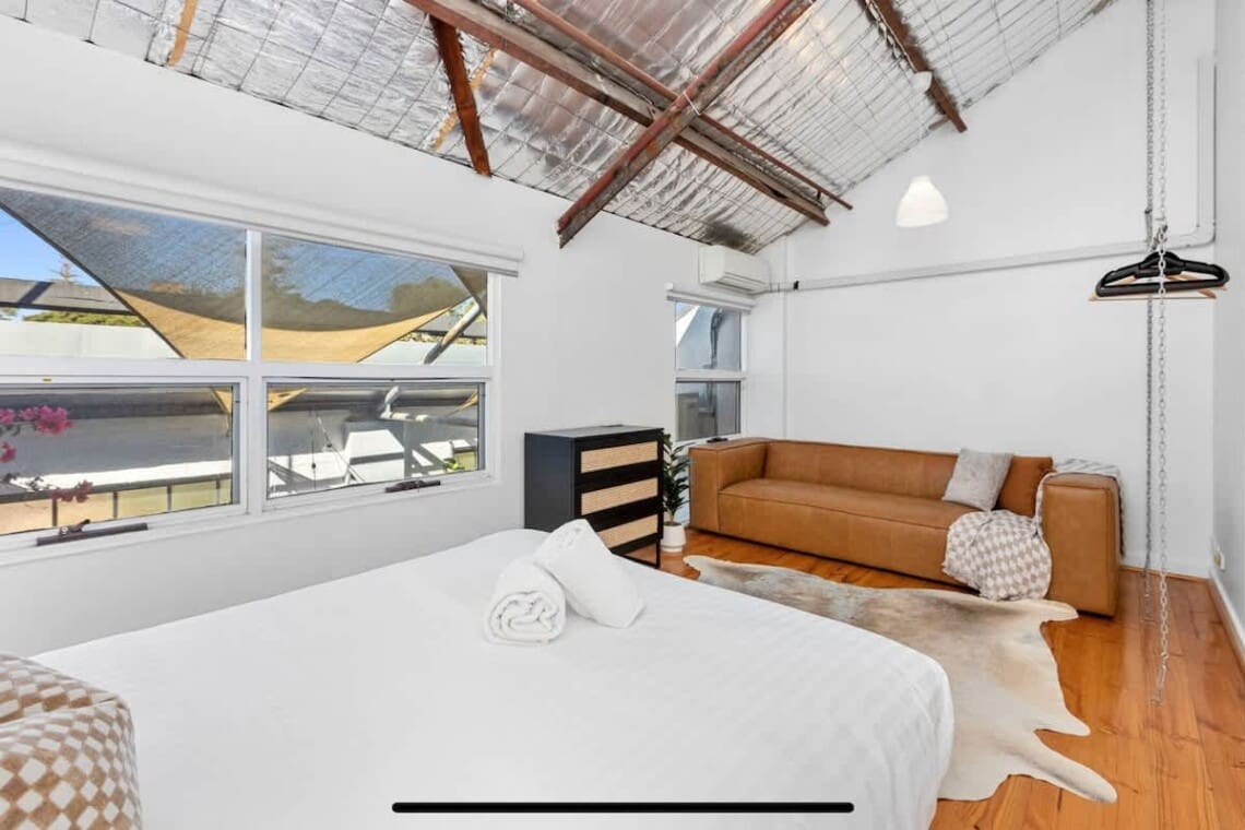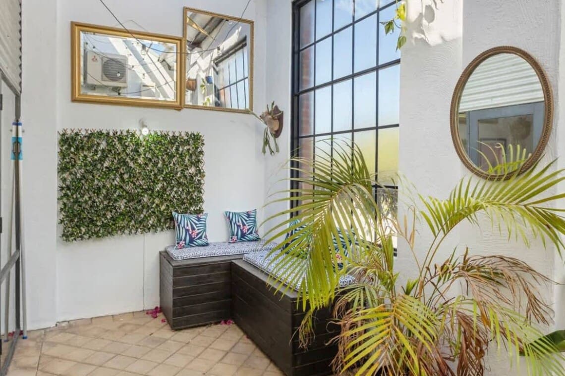 WOW factor Warehouse style North Fremantle townhouse – 2 BR, 1.5 BA & Parking. 15 mins walk to Port Beach for sun, sea & surf! Our stunning, supercool & edgy pad will leave you wanting more. Full kitchen, HUGE smart TV, comfy couch to rest & relax. Unwind at the famous music bar of Mojo’s – literally across the road! Cafes, dining right on the doorstep. Washer, bath, shower & 2 toilets. This beautiful townhouse is full of light & your private inner courtyard step out from the kitchen.