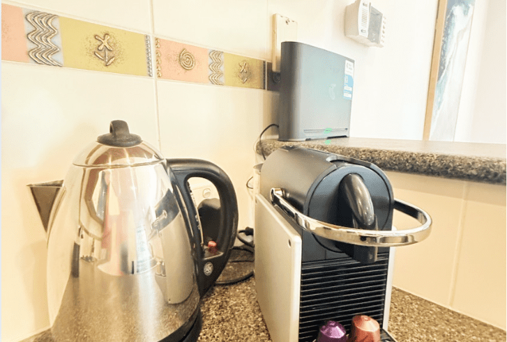 * Microwave, toaster, kettle, and coffee machine