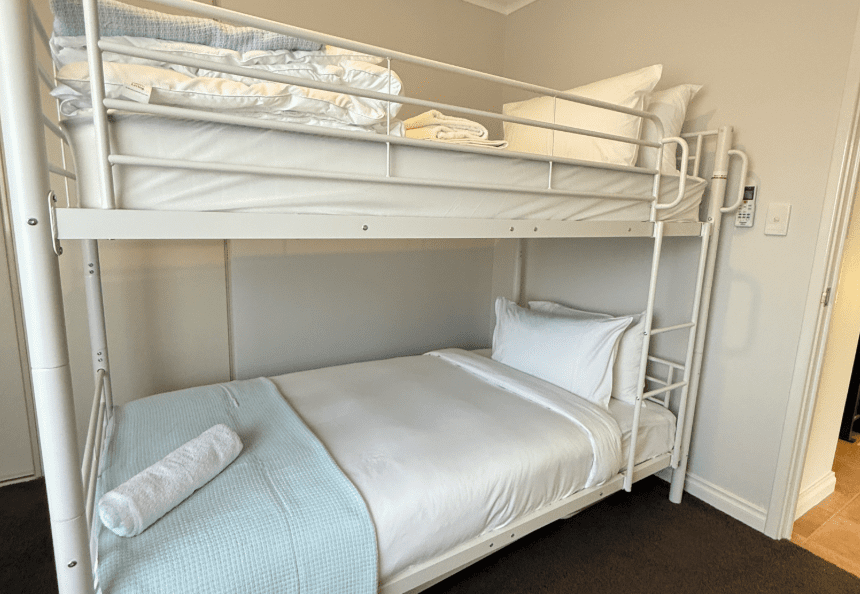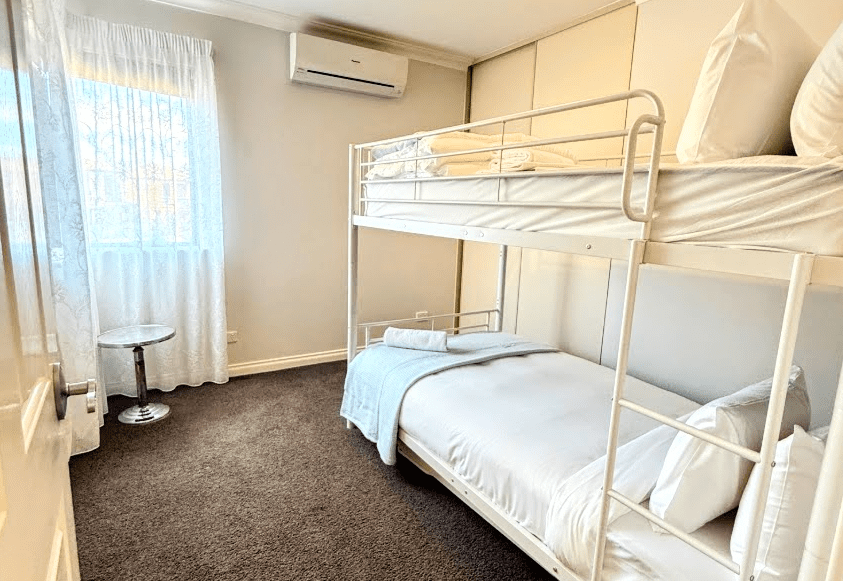 * 4 bedrooms – master has King Bed, one QB bedroom downstairs, one QB upstairs & one king single bunk beds (3 bedrooms upstairs, 1 bedroom downstairs)