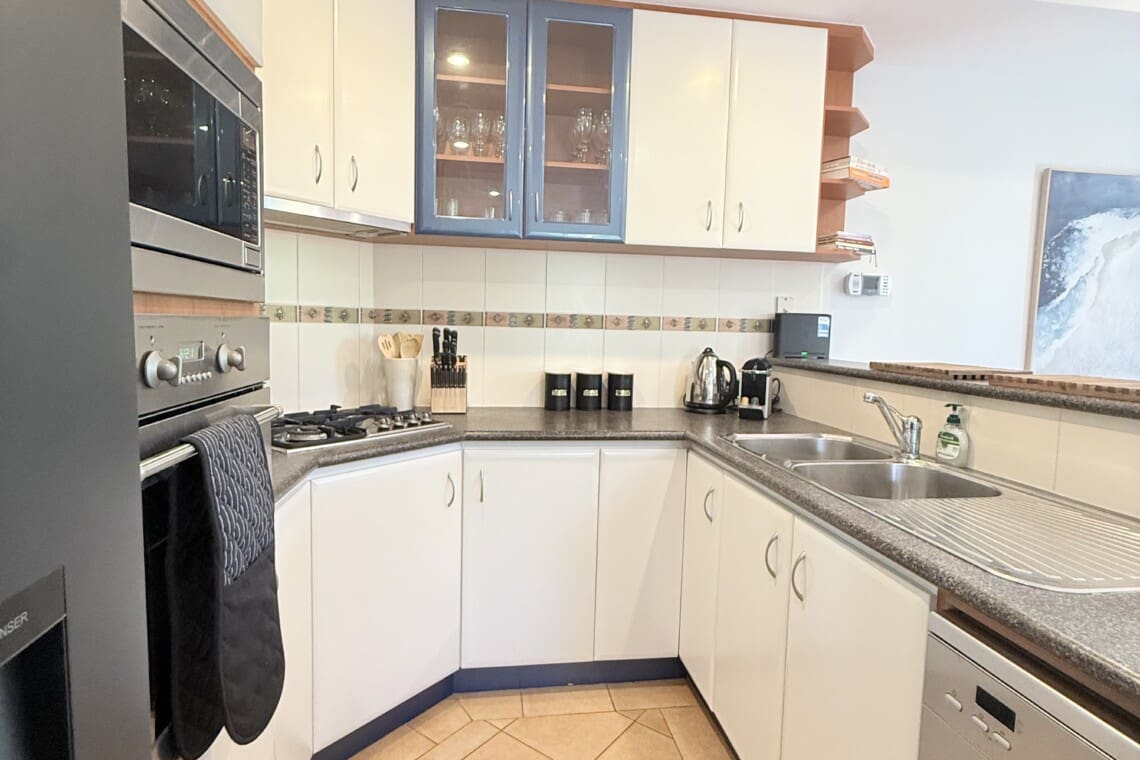 * Fully equipped modern kitchen with oven, stove, and rangehood